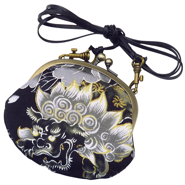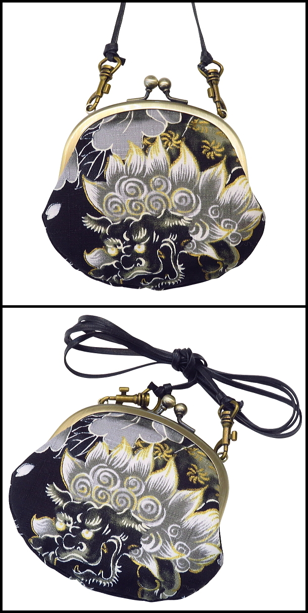がま口ショルダー 3.3寸 「唐獅子牡丹と桜吹雪・黒」小銭・小物入れ・日本製