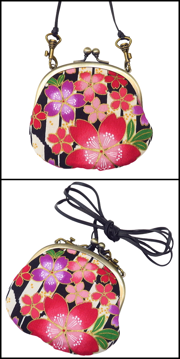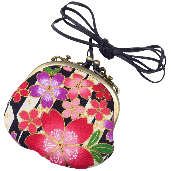 がま口ショルダー 3.3寸 「矢羽に桜・黒系」小銭・小物入れ・日本製