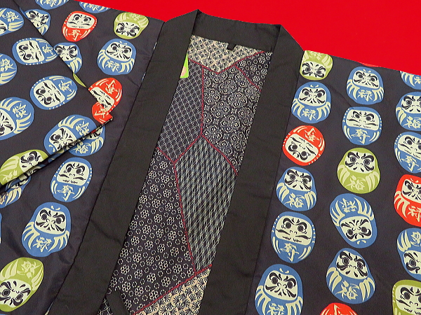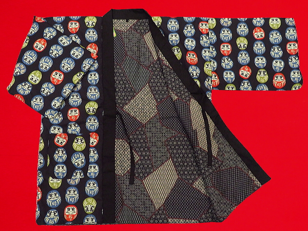 【送料無料】アンティーク和柄!綿入れ半纏リバーシブル(達磨尽くし 黒)男性用フリーサイズ