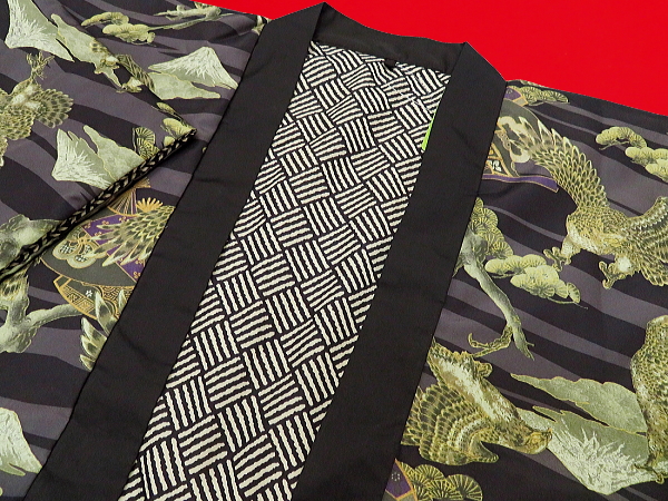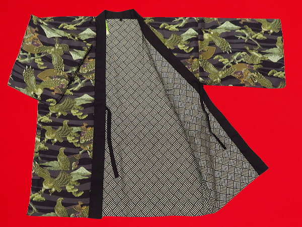 【送料無料】アンティーク和柄!綿入れ半纏リバーシブル(鷹と富士 黒系)男性用フリーサイズ